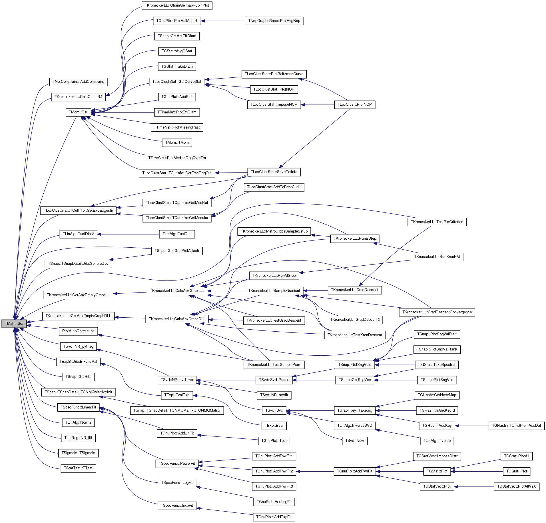Referenced by TNetConstraint< PGraph >::AddConstraint(), TKroneckerLL::CalcChainR2(), TMom::Def(), TLinAlg::EuclDist2(), TSnap::GenGeoPrefAttach(), TKroneckerLL::GetApxEmptyGraphDLL(), TKroneckerLL::GetApxEmptyGraphLL(), TExpBi::GetBiFuncVal(), TLocClustStat::TCutInfo::GetExpEdgesIn(), TSnap::GetHits(), TSnap::TSnapDetail::GetSphereDev(), TSnap::TSnapDetail::TCNMQMatrix::Init(), TSpecFunc::LinearFit(), TLinAlg::Norm2(), TLinReg::NR_lfit(), TSvd::NR_pythag(), PlotAutoCorrelation(), TKroneckerLL::TestBicCriterion(), TSigmoid::TSigmoid(), and TStatTest::TTest().