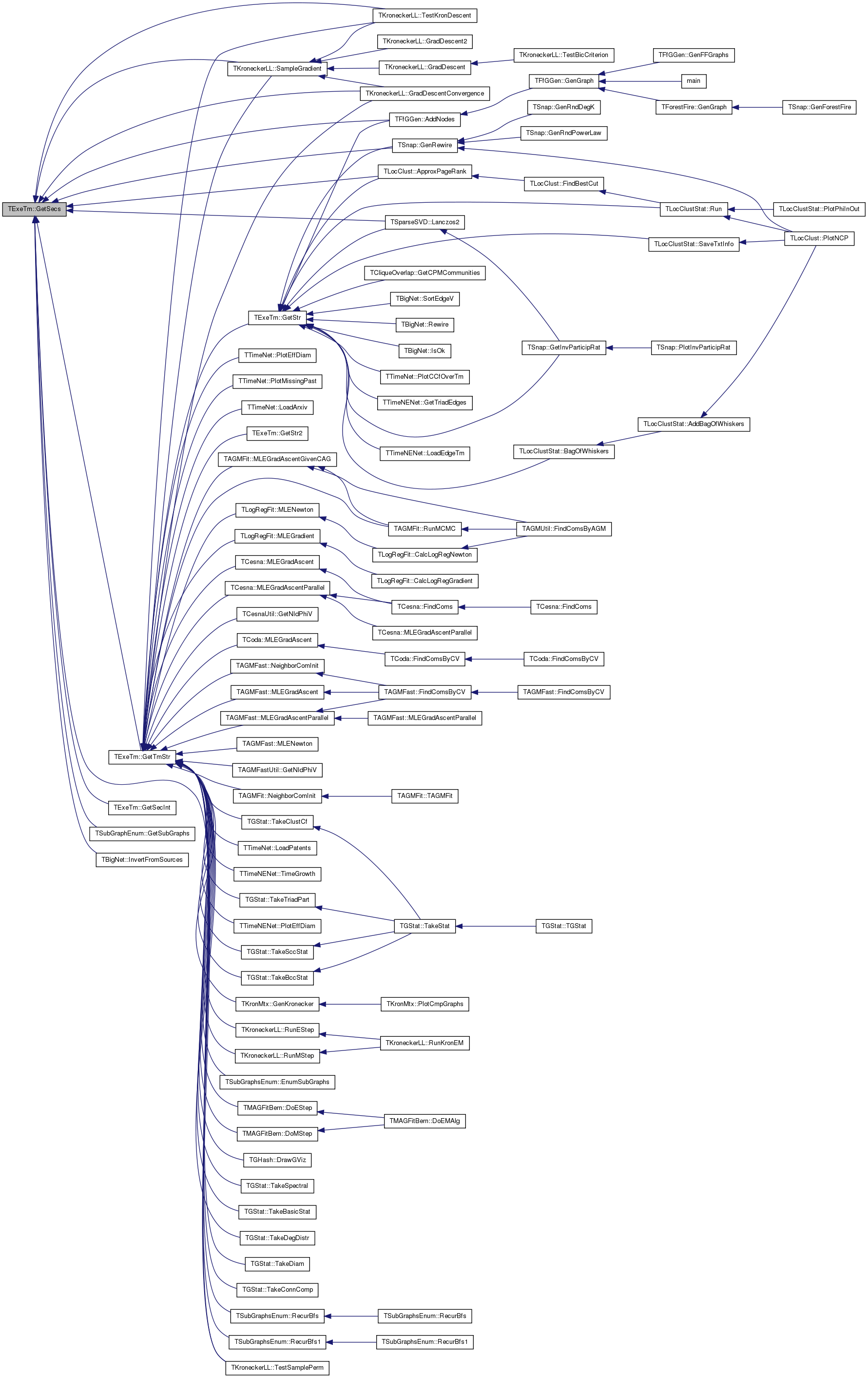 Referenced by TMAGFitBern::DoEStep(), TMAGFitBern::DoMStep(), TGHash< TDat >::DrawGViz(), TSubGraphsEnum::EnumSubGraphs(), TKronMtx::GenKronecker(), TCesnaUtil::GetNIdPhiV(), TAGMFastUtil::GetNIdPhiV(), GetStr(), GetStr2(), TKroneckerLL::GradDescentConvergence(), TTimeNet::LoadArxiv(), TTimeNet::LoadPatents(), TAGMFast::MLEGradAscent(), TCoda::MLEGradAscent(), TCesna::MLEGradAscent(), TAGMFit::MLEGradAscentGivenCAG(), TAGMFast::MLEGradAscentParallel(), TCesna::MLEGradAscentParallel(), TLogRegFit::MLEGradient(), TAGMFast::MLENewton(), TLogRegFit::MLENewton(), TAGMFast::NeighborComInit(), TAGMFit::NeighborComInit(), TTimeNet::PlotEffDiam(), TTimeNENet::PlotEffDiam(), TTimeNet::PlotMissingPast(), TSubGraphsEnum::RecurBfs(), TSubGraphsEnum::RecurBfs1(), TKroneckerLL::RunEStep(), TAGMFit::RunMCMC(), TKroneckerLL::RunMStep(), TKroneckerLL::SampleGradient(), TGStat::TakeBasicStat(), TGStat::TakeBccStat(), TGStat::TakeClustCf(), TGStat::TakeConnComp(), TGStat::TakeDegDistr(), TGStat::TakeDiam(), TGStat::TakeSccStat(), TGStat::TakeSpectral(), TGStat::TakeTriadPart(), TKroneckerLL::TestKronDescent(), TKroneckerLL::TestSamplePerm(), and TTimeNENet::TimeGrowth().