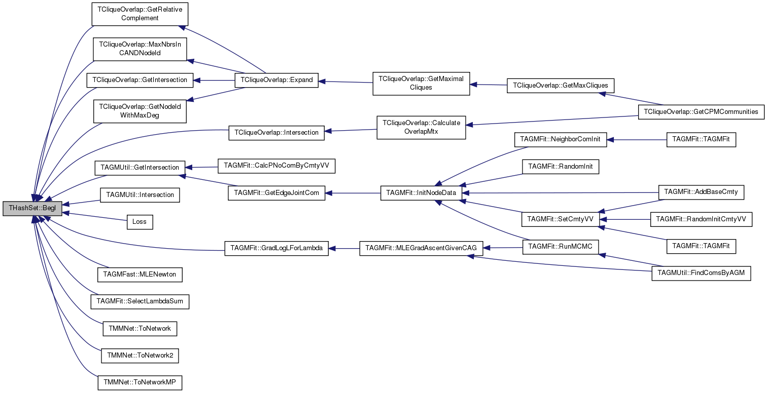 Referenced by TLocClustStat::BagOfWhiskers(), THashSet< TInt >::BegI(), TUndirFFire::BurnGeoFire(), TAGMFit::CalcPNoComByCmtyVV(), TSnap::CascFind(), TSnap::CntUniqDirEdges(), TSnap::CntUniqUndirEdges(), TAGMUtil::ConnectCmtyVV(), TSnap::TSnapDetail::TGetSubGraph< PGraph, false >::Do(), THashSet< TInt >::Empty(), TCliqueOverlap::Expand(), TSnap::GenPrefAttach(), TSnap::GenRewire(), TSnap::GenSmallWorld(), TCesnaUtil::GetConductance(), TAGMUtil::GetConductance(), TAGMFastUtil::GetConductance(), TLocClust::GetCutStat(), TAGMFit::GetEdgeJointCom(), TCliqueOverlap::GetIntersection(), TAGMUtil::GetIntersection(), TUndirFFire::GetNBurned(), TTimeNENet::GetPrefAttach(), THashSet< TInt >::GetRndKeyId(), TSnap::GetTriads_v0(), TNodeEdgeNet< TNodeData, TEdgeData >::GetUniqEdges(), TCoda::GradientForNode(), TAGMFast::GradientForRow(), TCesna::GradientForRow(), TAGMFit::GradLogLForLambda(), TCliqueOverlap::Intersection(), TAGMUtil::Intersection(), TAGMFit::Likelihood(), Loss(), THashSet< TKey, THashFunc >::operator==(), TGnuPlot::PlotValMomH(), TNetInfBs::SavePajek(), TLocClustStat::SaveTxtInfo(), TAGMFit::SeekJoin(), TAGMFit::SeekLeave(), and TAGMFit::SeekSwitch().