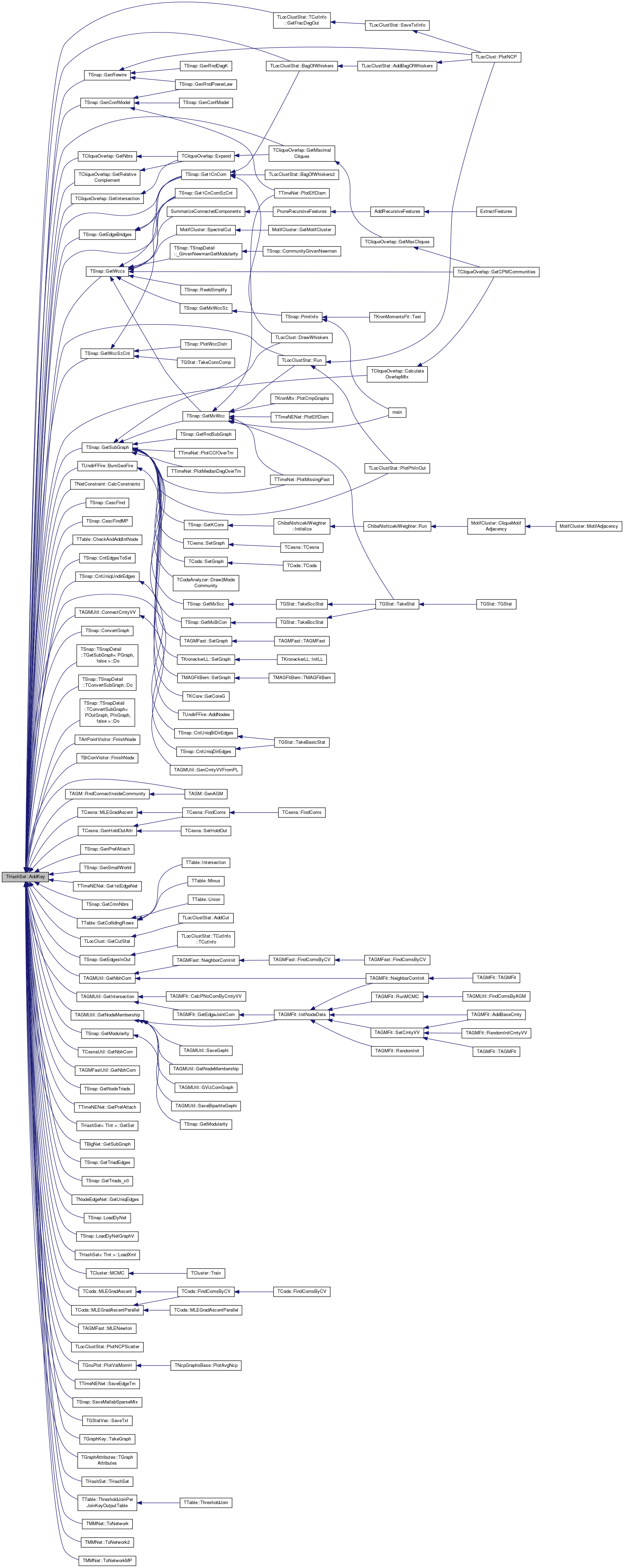 Referenced by TLocClustStat::BagOfWhiskers(), TUndirFFire::BurnGeoFire(), TNetConstraint< PGraph >::CalcConstraints(), TCliqueOverlap::CalculateOverlapMtx(), TSnap::CascFind(), TSnap::CascFindMP(), TTable::CheckAndAddIntNode(), TSnap::CntEdgesToSet(), TSnap::CntUniqDirEdges(), TSnap::CntUniqUndirEdges(), TAGMUtil::ConnectCmtyVV(), TSnap::ConvertGraph(), TSnap::TSnapDetail::TGetSubGraph< PGraph, false >::Do(), TSnap::TSnapDetail::TConvertSubGraph< POutGraph, PInGraph, IsMultiGraph >::Do(), TSnap::TSnapDetail::TConvertSubGraph< POutGraph, PInGraph, false >::Do(), TArtPointVisitor::FinishNode(), TBiConVisitor::FinishNode(), TAGM::GenAGM(), TSnap::GenConfModel(), TCesna::GenHoldOutAttr(), TSnap::GenPrefAttach(), TSnap::GenRewire(), TSnap::GenSmallWorld(), TSnap::Get1CnCom(), TSnap::Get1CnComSzCnt(), TTimeNENet::Get1stEdgeNet(), TSnap::GetCmnNbrs(), TTable::GetCollidingRows(), TLocClust::GetCutStat(), TSnap::GetEdgeBridges(), TSnap::GetEdgesInOut(), TLocClustStat::TCutInfo::GetFracDegOut(), TCliqueOverlap::GetIntersection(), TAGMUtil::GetIntersection(), TCliqueOverlap::GetMaximalCliques(), TSnap::GetModularity(), TAGMUtil::GetNbhCom(), TCesnaUtil::GetNbhCom(), TAGMFastUtil::GetNbhCom(), TCliqueOverlap::GetNbrs(), TAGMUtil::GetNodeMembership(), TSnap::GetNodeTriads(), TTimeNENet::GetPrefAttach(), TCliqueOverlap::GetRelativeComplement(), THashSet< TInt >::GetSet(), TSnap::GetSubGraph(), TBigNet< TNodeData, IsDir >::GetSubGraph(), TSnap::GetTriadEdges(), TSnap::GetTriads_v0(), TNodeEdgeNet< TNodeData, TEdgeData >::GetUniqEdges(), TSnap::GetWccs(), TSnap::GetWccSzCnt(), TSnap::LoadDyNet(), TSnap::LoadDyNetGraphV(), THashSet< TInt >::LoadXml(), TCluster::MCMC(), TCoda::MLEGradAscent(), TCesna::MLEGradAscent(), TCoda::MLEGradAscentParallel(), TAGMFast::MLENewton(), TLocClustStat::PlotNCPScatter(), TGnuPlot::PlotValMomH(), TAGM::RndConnectInsideCommunity(), TLocClustStat::Run(), TTimeNENet::SaveEdgeTm(), TSnap::SaveMatlabSparseMtx(), TGStatVec::SaveTxt(), TGraphKey::TakeGraph(), TGraphAttributes::TGraphAttributes(), THashSet< TKey, THashFunc >::THashSet(), TTable::ThresholdJoinPerJoinKeyOutputTable(), TMMNet::ToNetwork(), TMMNet::ToNetwork2(), and TMMNet::ToNetworkMP().