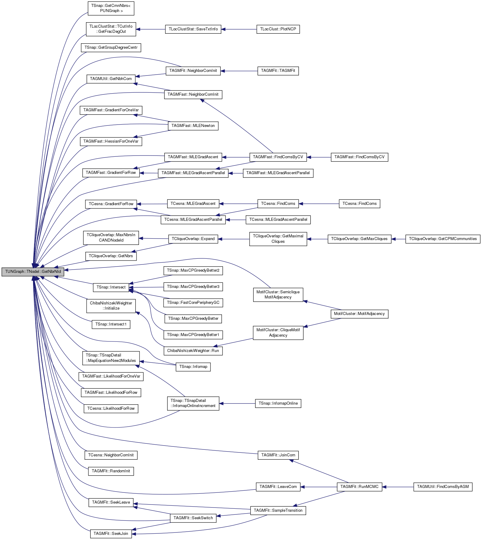 Referenced by TSnap::GetCmnNbrs< PUNGraph >(), TLocClustStat::TCutInfo::GetFracDegOut(), TSnap::GetGroupDegreeCentr(), TAGMUtil::GetNbhCom(), TCliqueOverlap::GetNbrs(), TAGMFast::GradientForOneVar(), TAGMFast::GradientForRow(), TCesna::GradientForRow(), TAGMFast::HessianForOneVar(), TSnap::Infomap(), TSnap::TSnapDetail::InfomapOnlineIncrement(), ChibaNishizekiWeighter::Initialize(), TSnap::Intersect(), TSnap::Intersect1(), TAGMFit::JoinCom(), TAGMFit::LeaveCom(), TAGMFast::LikelihoodForOneVar(), TAGMFast::LikelihoodForRow(), TCesna::LikelihoodForRow(), TSnap::TSnapDetail::MapEquationNew2Modules(), TCliqueOverlap::MaxNbrsInCANDNodeId(), TAGMFast::MLEGradAscent(), TAGMFast::MLEGradAscentParallel(), TCesna::MLEGradAscentParallel(), TAGMFast::MLENewton(), TAGMFast::NeighborComInit(), TAGMFit::NeighborComInit(), TCesna::NeighborComInit(), TAGMFit::RandomInit(), TAGMFit::SeekJoin(), TAGMFit::SeekLeave(), TAGMFit::SeekSwitch(), and MotifCluster::SemicliqueMotifAdjacency().