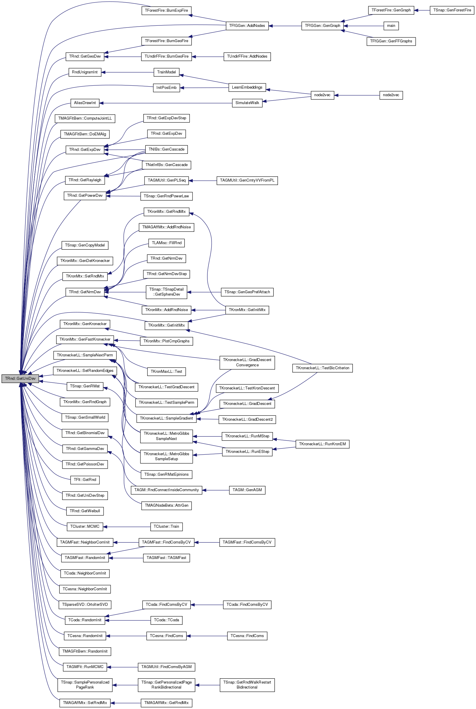 Referenced by TFfGGen::AddNodes(), AliasDrawInt(), TForestFire::BurnExpFire(), TMAGFitBern::ComputeJointLL(), TMAGFitBern::DoEMAlg(), TNIBs::GenCascade(), TSnap::GenCopyModel(), TKronMtx::GenDetKronecker(), TKronMtx::GenFastKronecker(), TKronMtx::GenKronecker(), TSnap::GenRMat(), TKronMtx::GenRndGraph(), TSnap::GenSmallWorld(), GetBinomialDev(), GetExpDev(), GetGammaDev(), GetGeoDev(), TKronMtx::GetInitMtx(), GetNrmDev(), GetPoissonDev(), GetPowerDev(), GetRayleigh(), TFlt::GetRnd(), GetUniDevStep(), GetWeibull(), InitPosEmb(), TCluster::MCMC(), TAGMFast::NeighborComInit(), TCoda::NeighborComInit(), TCesna::NeighborComInit(), TSparseSVD::OrtoIterSVD(), TAGMFast::RandomInit(), TCoda::RandomInit(), TCesna::RandomInit(), TMAGFitBern::RandomInit(), RndUnigramInt(), TAGMFit::RunMCMC(), TKroneckerLL::SampleNextPerm(), TSnap::SamplePersonalizedPageRank(), TKroneckerLL::SetRandomEdges(), TMAGAffMtx::SetRndMtx(), and TKronMtx::SetRndMtx().
